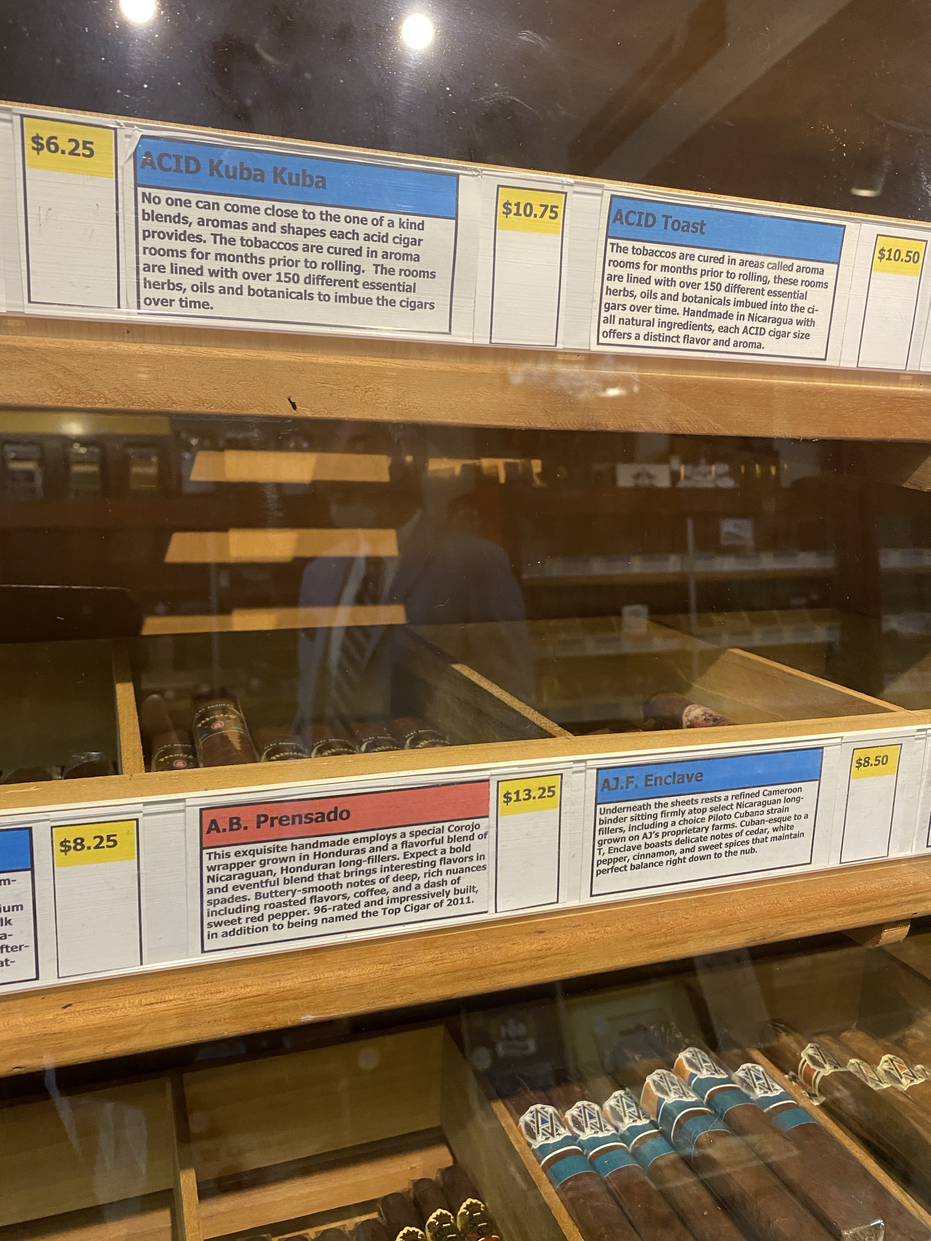 The humidor had a good selection without seeming like it was overly packed. They have their own rating system so you will always get a cigar you like. One of the few places who still does pipes and had some great blends.