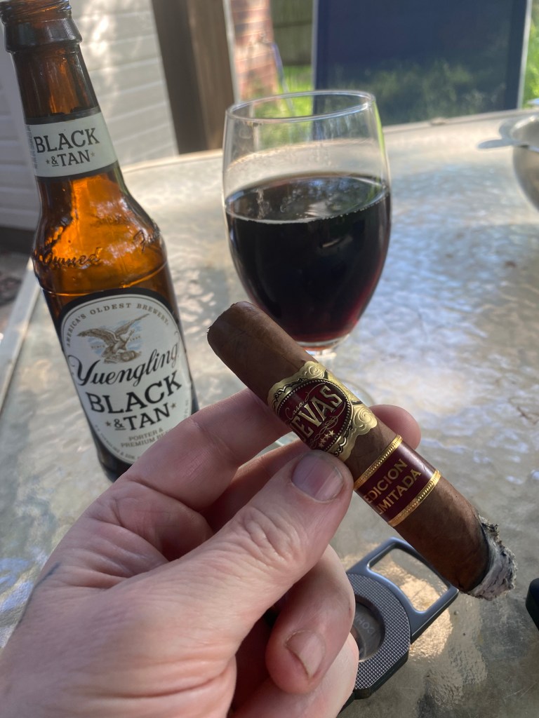This looks to be a very well crafted cigar. The smooth Habano wrapper stops about 1/2” from the foot, which has rich aromas of earth and fruit. The cap sports a nice pigtail. The cold draw is perfect. Also, this one has at least two years of humidor time. Today’s beverage is a Yuengling Black & Tan.