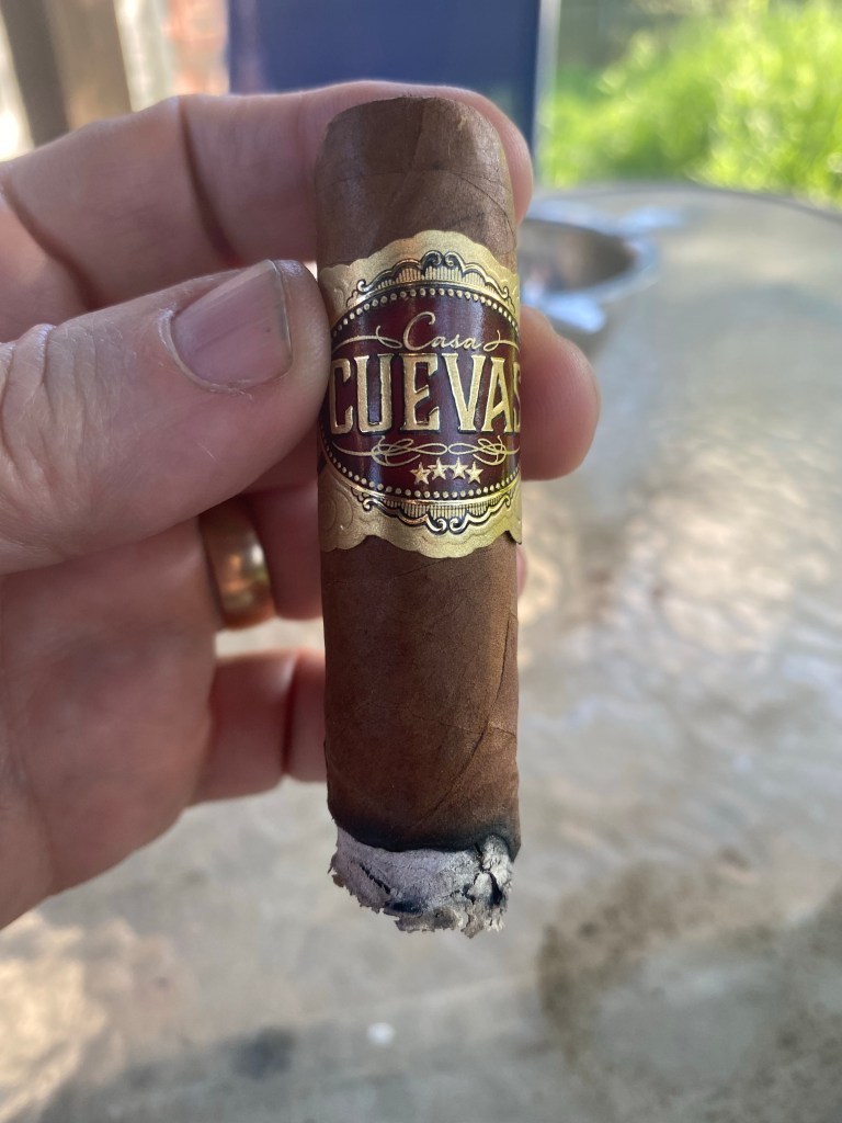 In the first third, the flavor profile picks up a peppery note when the burn starts on the wrapper. The earthy and sweet tones remain, but are somewhat muted by the wrapper. The retohale is fairly smooth with just the right amount of pepper. The beer is a solid pairing with just a touch of bitterness. The ash is firm but a bit splayed from the binder foot. The burn is much more even once it reaches the wrapper.