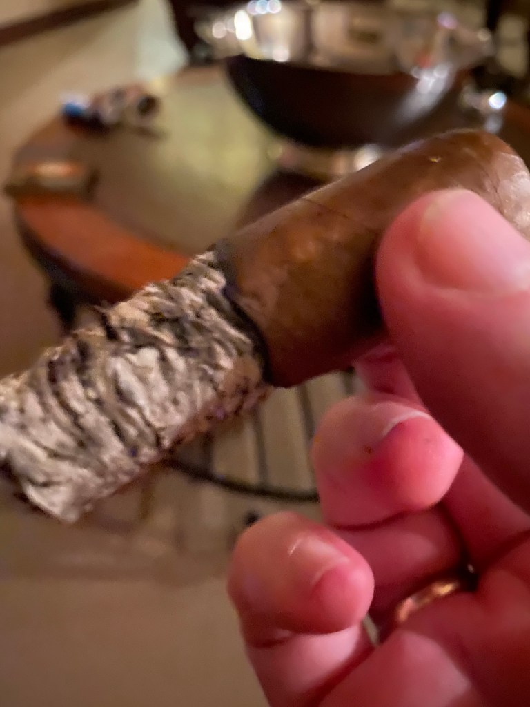 In the first third the flavor profile remains mostly smooth with remnants of salt. The retohale is very smooth. The ash is mottled grey and solid and the burn is even.