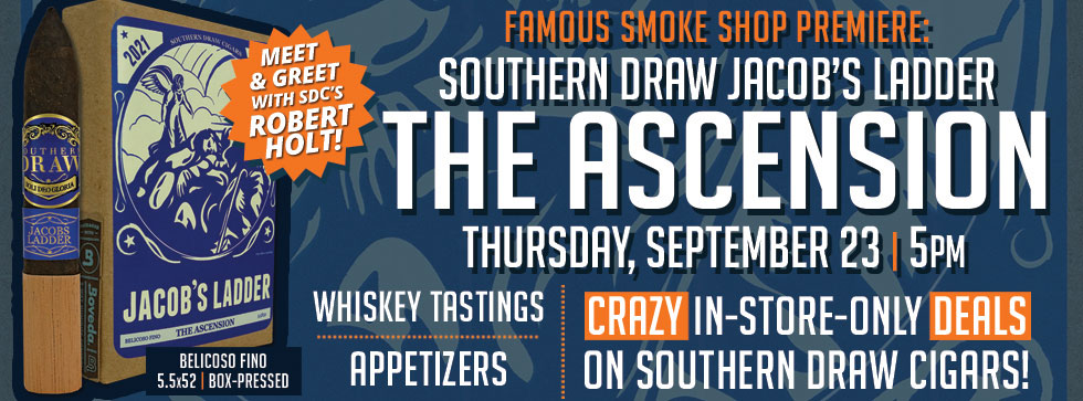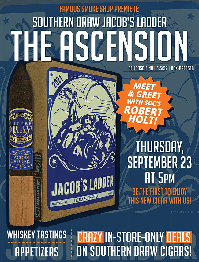 Not ironically and perfectly positioned, on September 23, 2021, Southern Draw Cigars will release the newest Jacobs Ladder, a Belicoso Fino which is 5.5×52, a size that we customarily offer with a box press and open foot format, a blend that takes us back to a 2013 version of this brand. Produced in September 2016 at AJ Fernandez Cigar Co., the celebratory release has been well aged and honors the 21st birthday of its namesake, Ethan Jacob Holt. Southern Draw Cigars is proud to announce that Famous Smoke Shop, Easton, PA will honor us by hosting the premiere release beginning at 5pm on September 23, 2021, with whiskey tastings and appetizers to celebrate the newest iteration of the Jacobs Ladder line. “We were wondering what Robert and Sharon had up their sleeves when we saw them next…turns out it’s this deep, rich, box pressed Belicoso. Been looking forward to having a cigar together with the Holts for quite a while – this one sure is worth the wait,” said longtime Famous buyer Humberto Gonzalez. “And we’re as excited as Robert is, to share this Jacob’s Ladder with everyone at Famous.”