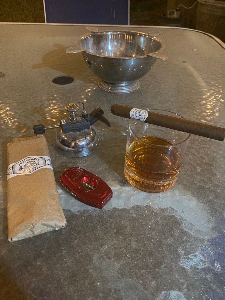 This is a very good looking Corona with a smooth and slightly oily wrapper. Aromas from the foot are earth and wood. The cold draw is perfect. Tonight’s beverage is a 3 oz pour of Woodford Reserve.
