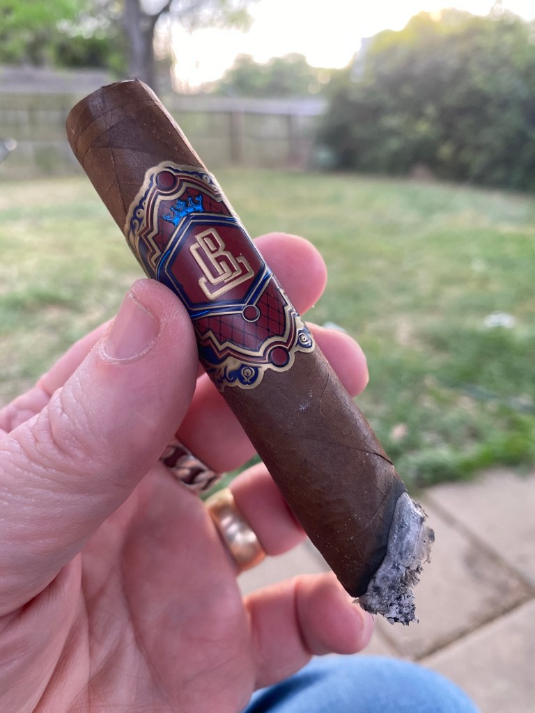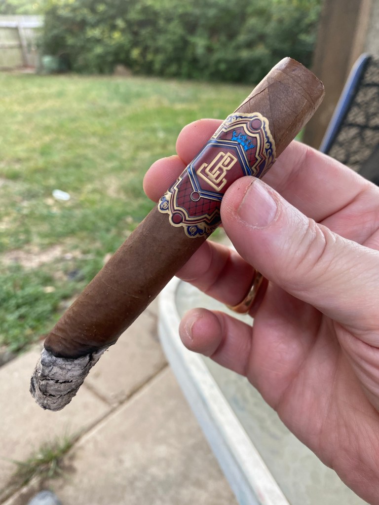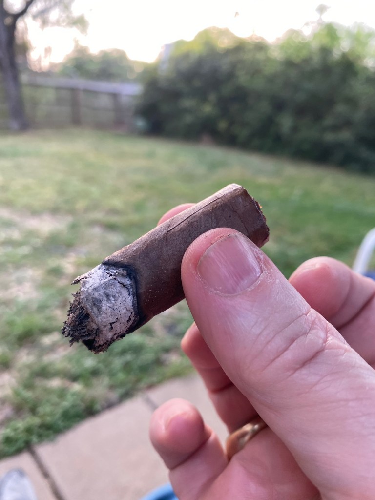 In the first third the flint is entirely gone, and a nice nutty flavor has picked up. The burn is running up one side and is causing a crack in the ash that will cause it to fall. A single tap on the ashtray knocks it all off.