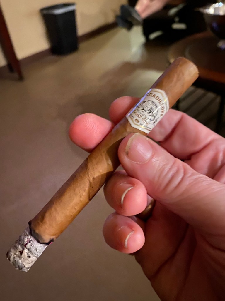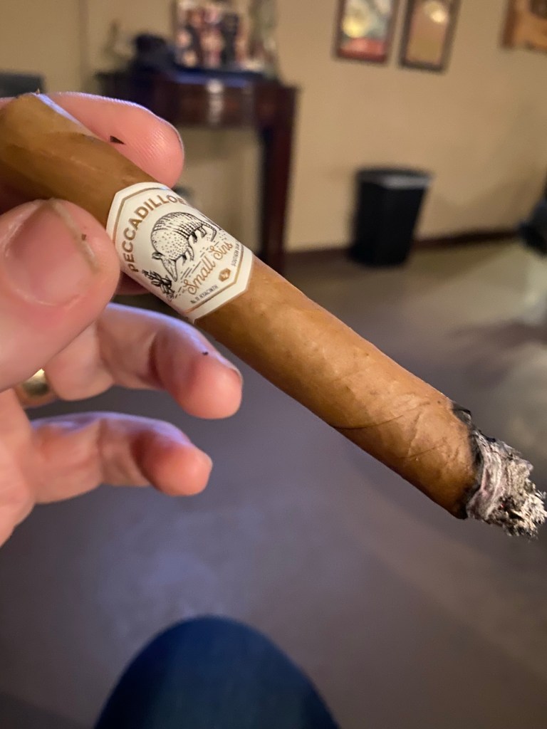 This is the darkest of the Pecadilloes. The wrapper is dark and smooth. There are light aromas of earth and leather from the foot. The cold draw is perfect. Today’s beverage is a cold brew Colombian coffee.