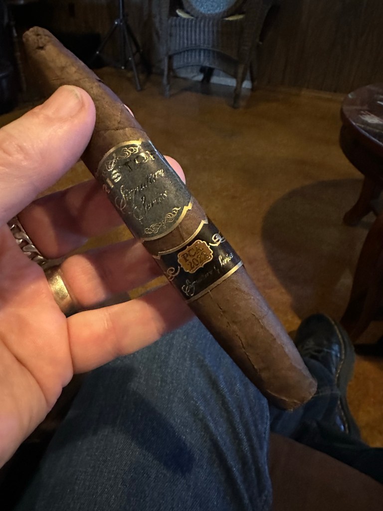 This cigar has a rich dark somewhat rustic wrapper. The perfect cold draw evidences rich tobacco and light coffee notes. Today’s beverage is a Lakewood Salted Caramel Temptress Imperial Milk Stout.