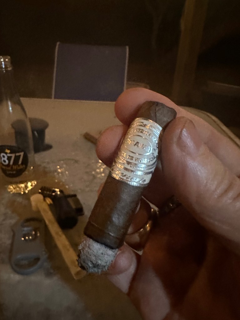 This is a beautiful Cigar with very little aroma from the foot. The cold draw is slightly tight, but I expect it will open up as the cigar burns. Tonight’s beverage is a 50ml pour of Clyde Mays Rye.