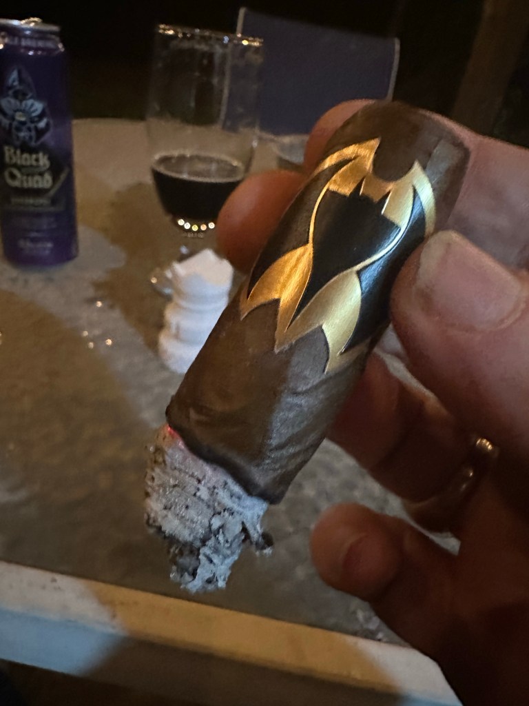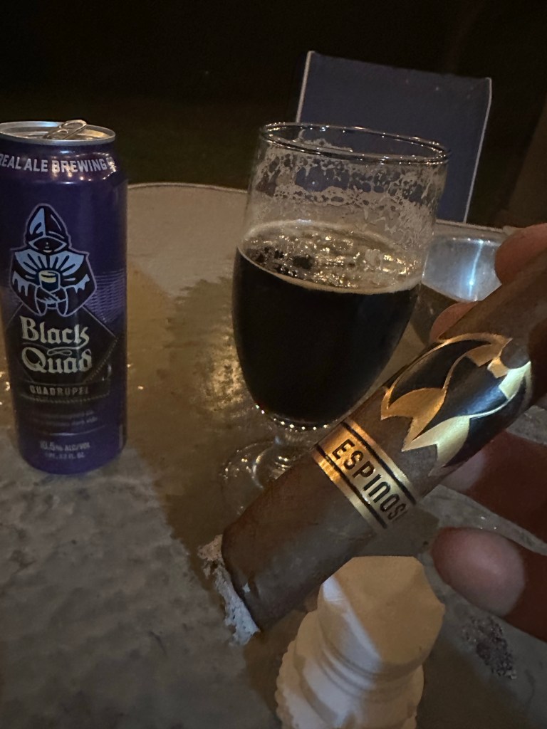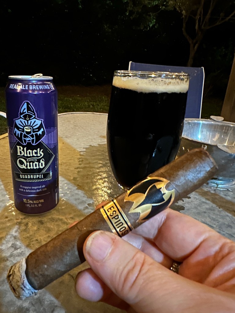 With a medium box press and the tradition of the Murcialago heritage, I expect a great cigar. The wrapper is dark San Andreas and the binder and filler are Nicaraguan. From the foot I can smell the earth and oak common to Nicaraguan cigars, but I detect something more. The cool draw is perfect, also showing off its Nicaraguan pedigree. A Real Ale Black Quad Trappist-style ale that has excellent malty flavors with some coffee notes is tonight’s beverage. I think it will be a good pairing.