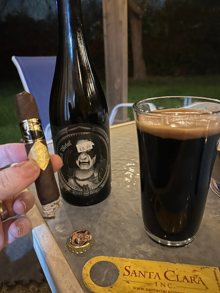 The cigar has a very smooth (almost velvety) feel with the trademark gold leaf diamond under the band. Used a punch and got a perfect draw that had tiny flavor notes of well cared for tobacco. Tonight’s beverage is a Jester King Black Metal. JK is in Dripping Springs northeast San Antonio and makes a great line of farmhouse style ales.