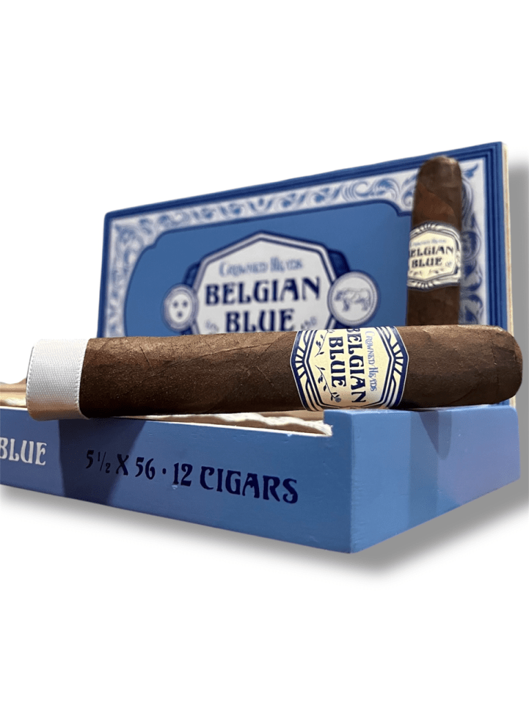 Crowned Heads Belgian Blue LE 2025 is a 5 1/2″ x 56 box-pressed cigar comprised of a blend of Nicaraguan and Dominican tobaccos, an Ecuadorian binder, and is finished with a dark Mexican (San Andres) wrapper. Packaged in 12-count boxes, worldwide production is limited