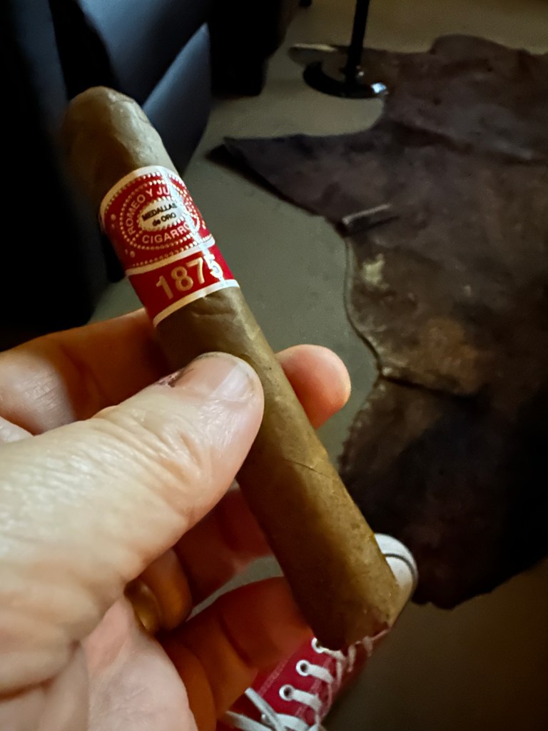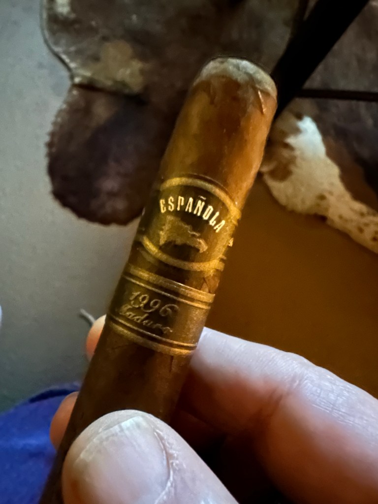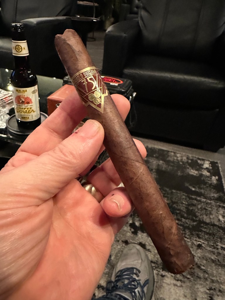 This cigar was created to honor the 75th birthday of the owner of the Quesada brand. It has a rich dark wrapper with coffee and tobacco notes from the foot. There are a couple of veins along the wrapper. Tonight’s beverage is a Real Ale Coffee Porter.