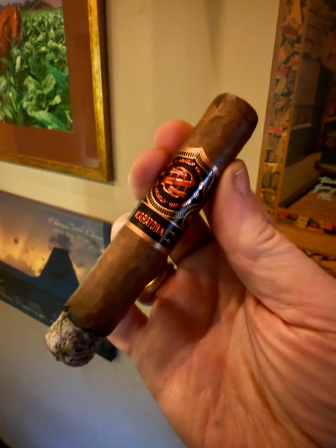In the first third light coffee notes and toasted tobacco join the flavor profile. This is a good medium to full bodied cigar. The burn and ash are perfect.
